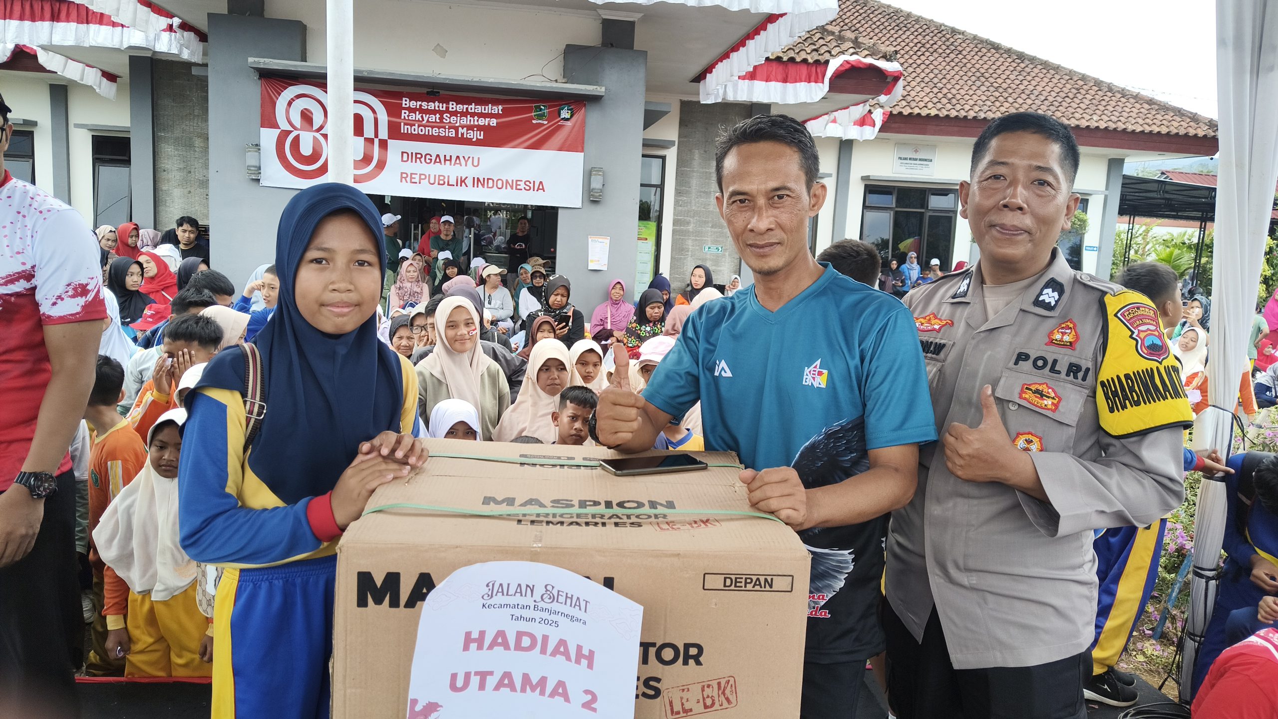Banjarnegara – Dalam rangka memperingati Hari Ulang Tahun Republik Indonesia (HUT RI) ke-80, Kecamatan Banjarnegara menggelar acara Jalan Sehat dan Senam Bersama yang berlangsung meriah di halaman Kantor Kecamatan Banjarnegara pada Rabu, 27 Agustus 2025. Acara yang diikuti oleh ribuan warga dari berbagai kalangan ini tidak hanya menjadi ajang silaturahmi, tetapi juga menyuguhkan berbagai hadiah menarik, seperti sepeda listrik, kulkas, mesin cuci, dan puluhan hadiah door prize lainnya.